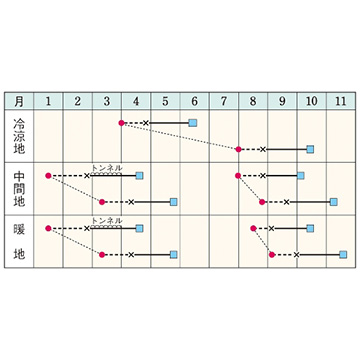 - 花期、収穫期(○○どり)、高さ、収穫重量などの性質は、一般平坦地における適期栽培でのおおよその目安です。