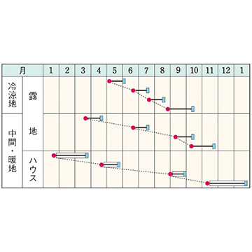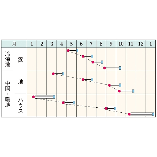 - 花期、収穫期(○○どり)、高さ、収穫重量などの性質は、一般平坦地における適期栽培でのおおよその目安です。