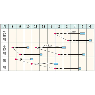 - 花期、収穫期(○○どり)、高さ、収穫重量などの性質は、一般平坦地における適期栽培でのおおよその目安です。