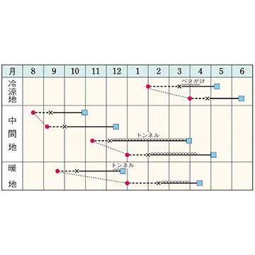 - 花期、収穫期(○○どり)、高さ、収穫重量などの性質は、一般平坦地における適期栽培でのおおよその目安です。
