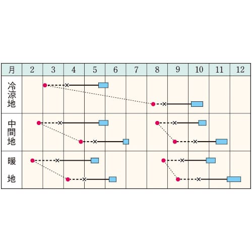 - 花期、収穫期(○○どり)、高さ、収穫重量などの性質は、一般平坦地における適期栽培でのおおよその目安です。