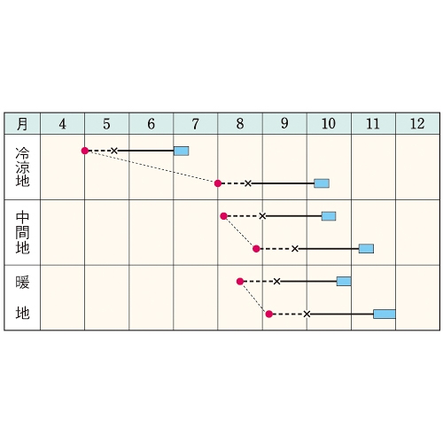 - 花期、収穫期(○○どり)、高さ、収穫重量などの性質は、一般平坦地における適期栽培でのおおよその目安です。