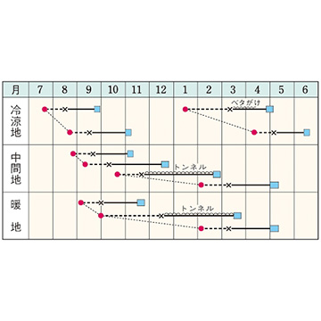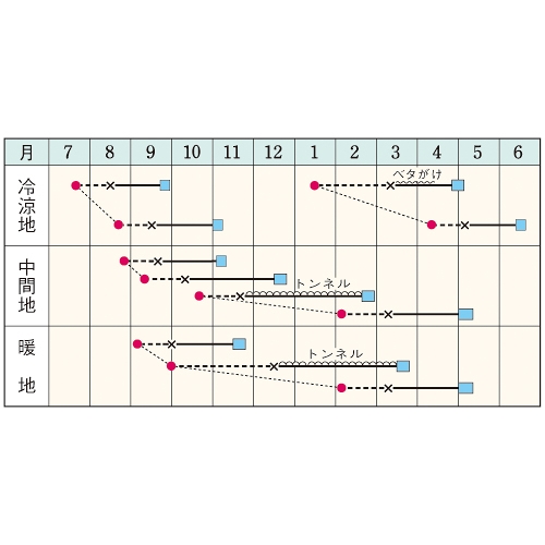 - 花期、収穫期(○○どり)、高さ、収穫重量などの性質は、一般平坦地における適期栽培でのおおよその目安です。