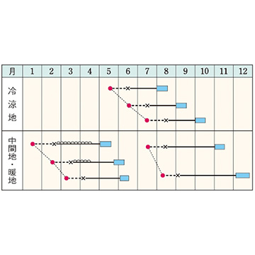 - 花期、収穫期(○○どり)、高さ、収穫重量などの性質は、一般平坦地における適期栽培でのおおよその目安です。