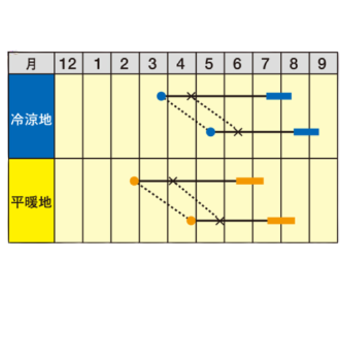 - 花期、収穫期(○○どり)、高さ、収穫重量などの性質は、一般平坦地における適期栽培でのおおよその目安です。