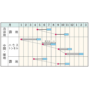 - 花期、収穫期(○○どり)、高さ、収穫重量などの性質は、一般平坦地における適期栽培でのおおよその目安です。