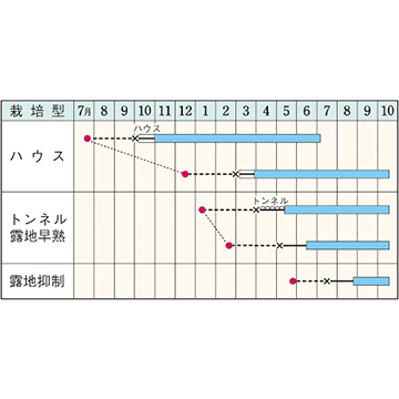 - 花期、収穫期(○○どり)、高さ、収穫重量などの性質は、一般平坦地における適期栽培でのおおよその目安です。