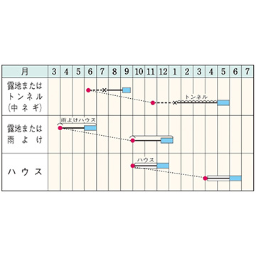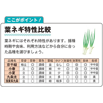 生育が早く旺盛で、ボリュームたっぷりの太りのよい葉ネギ。耐暑性や耐寒性も高く、秋から春どりの中ネギ栽培が適する。中ネギ栽培でも分けつが少なく良品収穫が期待できる。小ネギの周年栽培にも向く。