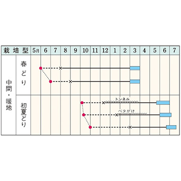 - 花期、収穫期(○○どり)、高さ、収穫重量などの性質は、一般平坦地における適期栽培でのおおよその目安です。