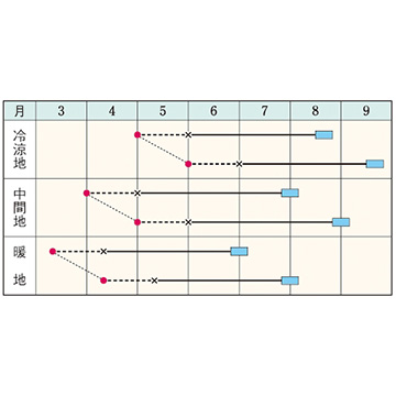 - 花期、収穫期(○○どり)、高さ、収穫重量などの性質は、一般平坦地における適期栽培でのおおよその目安です。