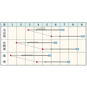 - 花期、収穫期(○○どり)、高さ、収穫重量などの性質は、一般平坦地における適期栽培でのおおよその目安です。