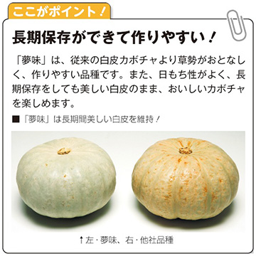 果面はスムーズでツヤがあり、美しい白皮に仕上がる。着果がよく、たくさん収穫できる。粉質で栗のような食感と甘みがあり食味がよい。日もち性に優れ、長期貯蔵が可能。葉は大きめで強勢だが、雌花のつきがよく着果が安定する。