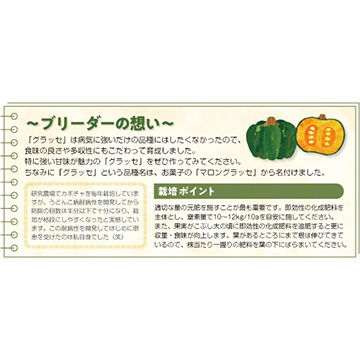うどんこ病耐病性(特許第6306252号)をもつことで作りやすさが格段に向上。栽培後半までつるもちがよく品質が安定する。果重は1.7~1.9kgで着果がよく、果実肥大力にすぐれるため多収。肉質は粉質と粘質の中間質。甘みとコクのバランスがよい。黒色果皮で外観にすぐれる。