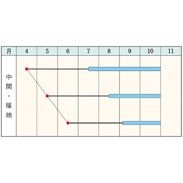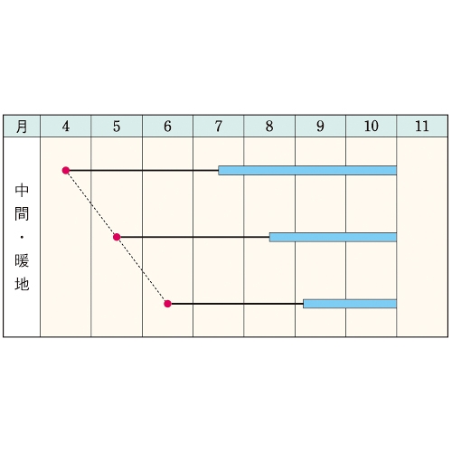 - 花期、収穫期(○○どり)、高さ、収穫重量などの性質は、一般平坦地における適期栽培でのおおよその目安です。