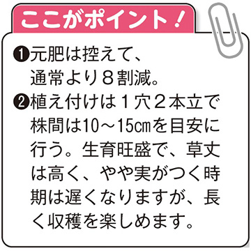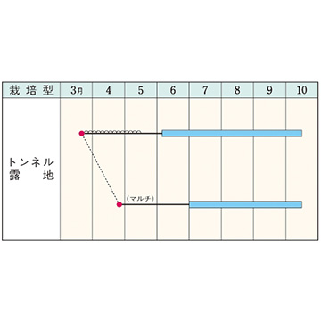 - 花期、収穫期(○○どり)、高さ、収穫重量などの性質は、一般平坦地における適期栽培でのおおよその目安です。