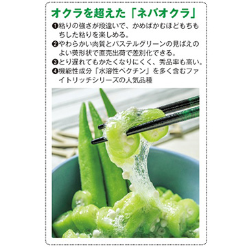肉厚でやわらかくおいしいパステルグリーンの丸莢種。オクラ特有の粘りが特に強く、水溶性ペクチン(食物繊維)が豊富。生育旺盛で作りやすく、直売所・家庭菜園に向く。