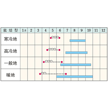 - 花期、収穫期(○○どり)、高さ、収穫重量などの性質は、一般平坦地における適期栽培でのおおよその目安です。