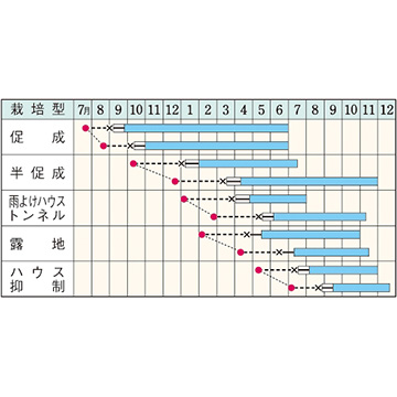 • 花期、収穫期(○○どり)、高さ、収穫重量などの性質は、一般平坦地における適期栽培でのおおよその目安です。