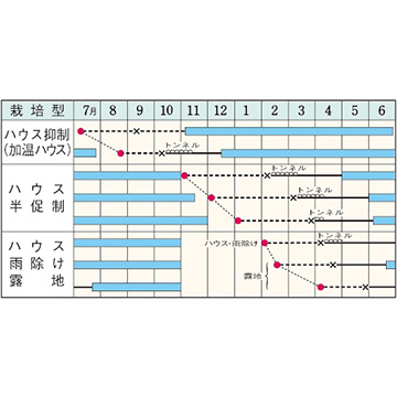 - 花期、収穫期(○○どり)、高さ、収穫重量などの性質は、一般平坦地における適期栽培でのおおよその目安です。