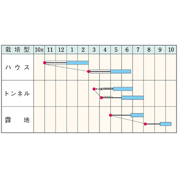 - 花期、収穫期(○○どり)、高さ、収穫重量などの性質は、一般平坦地における適期栽培でのおおよその目安です。