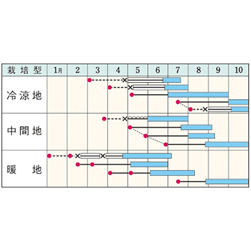 - 花期、収穫期(○○どり)、高さ、収穫重量などの性質は、一般平坦地における適期栽培でのおおよその目安です。