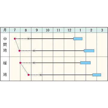 - 花期、収穫期(○○どり)、高さ、収穫重量などの性質は、一般平坦地における適期栽培でのおおよその目安です。