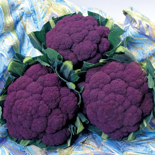 生育旺盛で作りやすい早生の紫カリフラワー。花蕾は豊円・肉厚で、しまりがよく、日もちもよい。紫色の花蕾に熱を加えると、明るい鮮緑色に変化する。