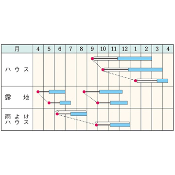 - 花期、収穫期(○○どり)、高さ、収穫重量などの性質は、一般平坦地における適期栽培でのおおよその目安です。