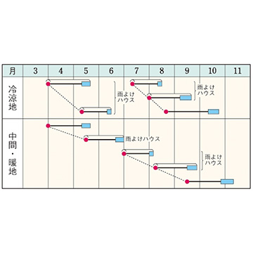 - 花期、収穫期(○○どり)、高さ、収穫重量などの性質は、一般平坦地における適期栽培でのおおよその目安です。