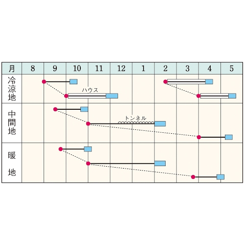 - 花期、収穫期(○○どり)、高さ、収穫重量などの性質は、一般平坦地における適期栽培でのおおよその目安です。