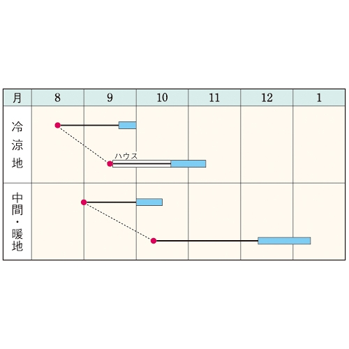 - 花期、収穫期(○○どり)、高さ、収穫重量などの性質は、一般平坦地における適期栽培でのおおよその目安です。