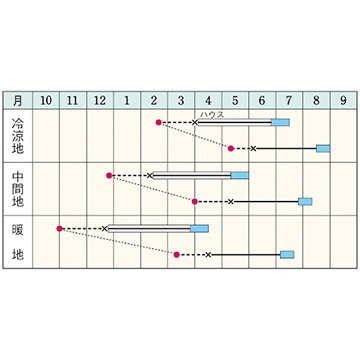 - 花期、収穫期(○○どり)、高さ、収穫重量などの性質は、一般平坦地における適期栽培でのおおよその目安です。