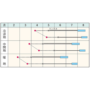 - 花期、収穫期(○○どり)、高さ、収穫重量などの性質は、一般平坦地における適期栽培でのおおよその目安です。