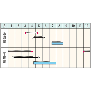 - 花期、収穫期(○○どり)、高さ、収穫重量などの性質は、一般平坦地における適期栽培でのおおよその目安です。