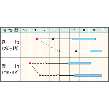 - 花期、収穫期(○○どり)、高さ、収穫重量などの性質は、一般平坦地における適期栽培でのおおよその目安です。