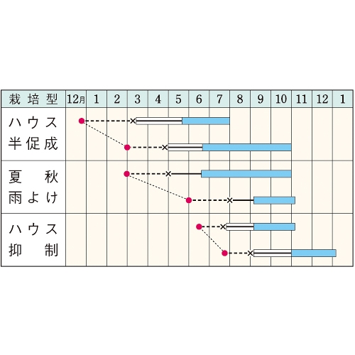 - 花期、収穫期(○○どり)、高さ、収穫重量などの性質は、一般平坦地における適期栽培でのおおよその目安です。