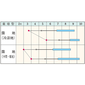 - 花期、収穫期(○○どり)、高さ、収穫重量などの性質は、一般平坦地における適期栽培でのおおよその目安です。