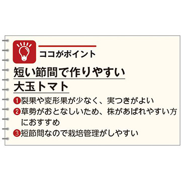 裂果や変形果の発生が少なく、夏秋栽培に向く大玉トマト。節間長は短めで、草勢はややおとなしい。着果、肥大がよく、硬玉で収穫後の日もちにも優れる。