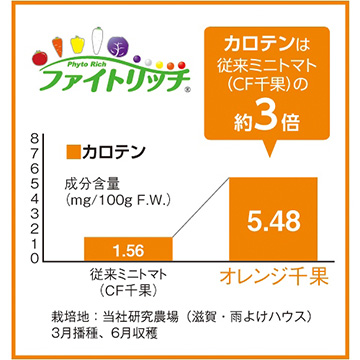 果色はきれいなオレンジ色。従来のミニトマトよりカロテン含量が約3倍で糖度も高く食味に優れる。千果に比べ、初期から草勢はおとなしく、ダブル果房の発生が少ない。