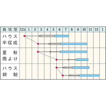 • 花期、収穫期(○○どり)、高さ、収穫重量などの性質は、一般平坦地における適期栽培でのおおよその目安です。
