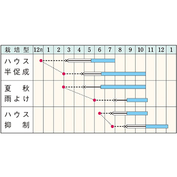 - 花期、収穫期(○○どり)、高さ、収穫重量などの性質は、一般平坦地における適期栽培でのおおよその目安です。