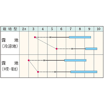 - 花期、収穫期(○○どり)、高さ、収穫重量などの性質は、一般平坦地における適期栽培でのおおよその目安です。