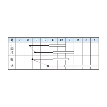 - 花期、収穫期(○○どり)、高さ、収穫重量などの性質は、一般平坦地における適期栽培でのおおよその目安です。
