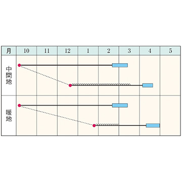 - 花期、収穫期(○○どり)、高さ、収穫重量などの性質は、一般平坦地における適期栽培でのおおよその目安です。