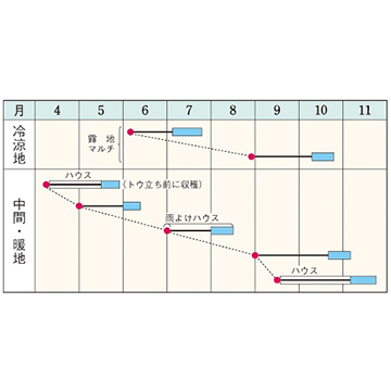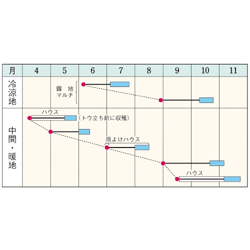 - 花期、収穫期(○○どり)、高さ、収穫重量などの性質は、一般平坦地における適期栽培でのおおよその目安です。