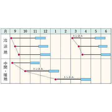 - 花期、収穫期(○○どり)、高さ、収穫重量などの性質は、一般平坦地における適期栽培でのおおよその目安です。