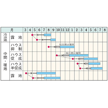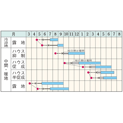 - 花期、収穫期(○○どり)、高さ、収穫重量などの性質は、一般平坦地における適期栽培でのおおよその目安です。