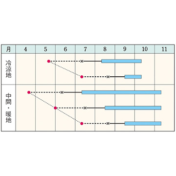 - 花期、収穫期(○○どり)、高さ、収穫重量などの性質は、一般平坦地における適期栽培でのおおよその目安です。