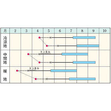 - 花期、収穫期(○○どり)、高さ、収穫重量などの性質は、一般平坦地における適期栽培でのおおよその目安です。