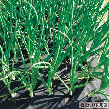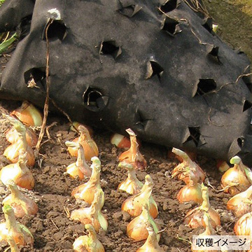 水をとおす不織布の穴あきマルチです。防草、泥はね防止、蒸散防止、保温効果があり、良質のタマネギ栽培に貢献します。マルチの上に肥料をバラまきし、追肥ができます。(中国製)